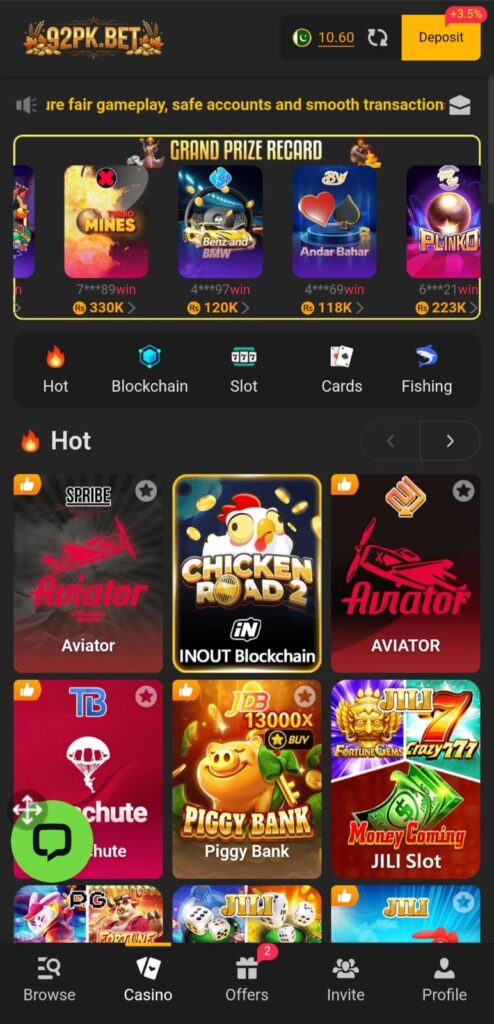 Here are popular earning options available on 92pk Game: